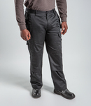 Part elasticated waistband with belt loops. Zip fly with stud over. Two front tradesman pockets. Two side pockets. Rear patch pockets. Two multi-use side leg cargo pockets. Ruler pocket. Media pocket. Hammer loop. External tear release knee pad pockets. Twin needle hem.